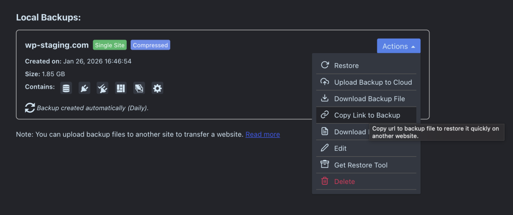 wpstaging add mysite.local --from=https://mysite.com/wp-content/.../backup_1234.wpstgGet the full path to a WP Staging backup from: Backup & Migration → Actions → Copy Link to Backup.