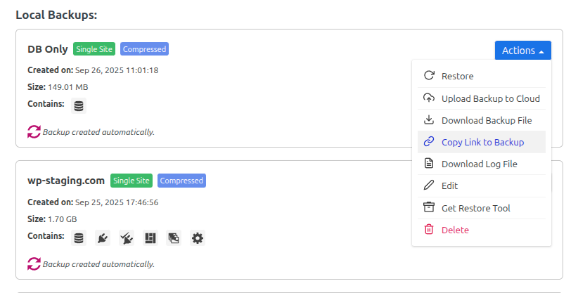 Go to WP Staging -> Backup & Migration. Select a backup and click on Actions -> Copy Link to Backup