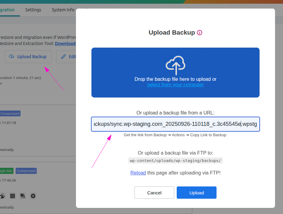Open WP Staging -> Backup & Migration on the destination remote server. Click on Upload Backup and paste the link to the backup file by using Ctrl+V (Win|Linux) or Cmd + V (Mac). The link contains a unique hash, making it unguessable by unauthorized parties to access it.